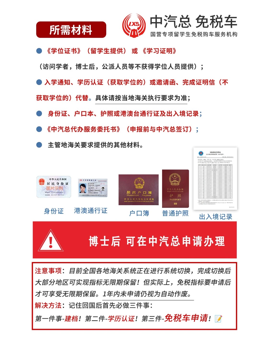 免税车申请需要毕业后首次回国之日起一年内到户籍所在地海关办理(部分地区可受理工作居住地申请)关封。
