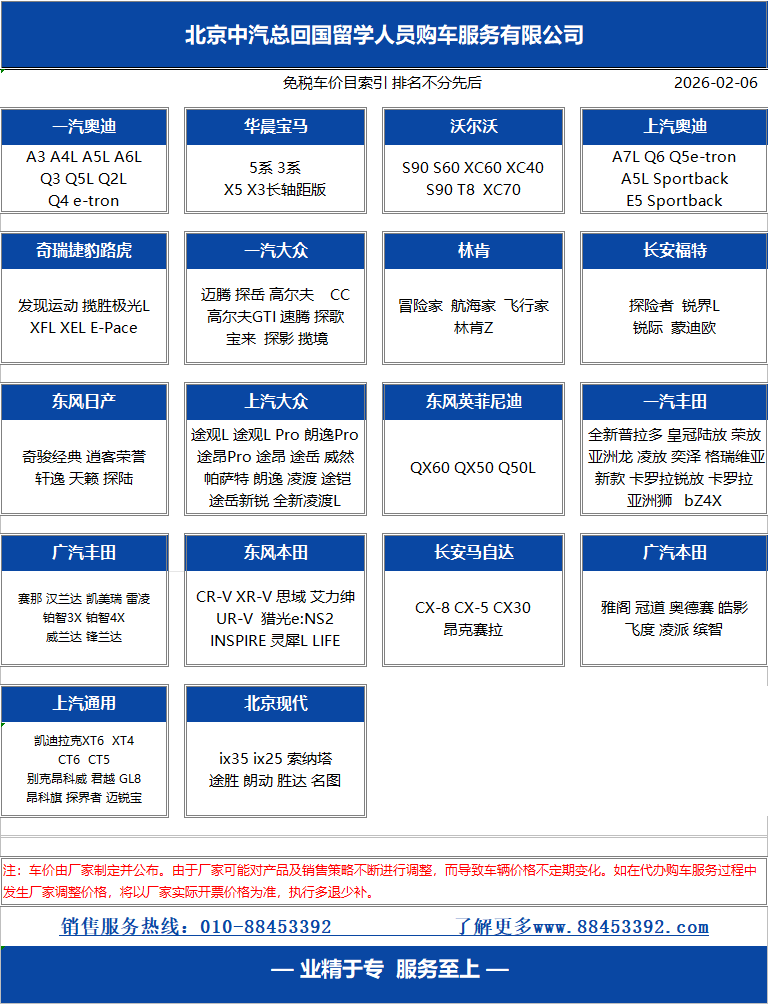 了解详细免税车价格可以登录:www.88453392.com中汽总免税车网站,下载《2026年最新免税车价格表》查询。
