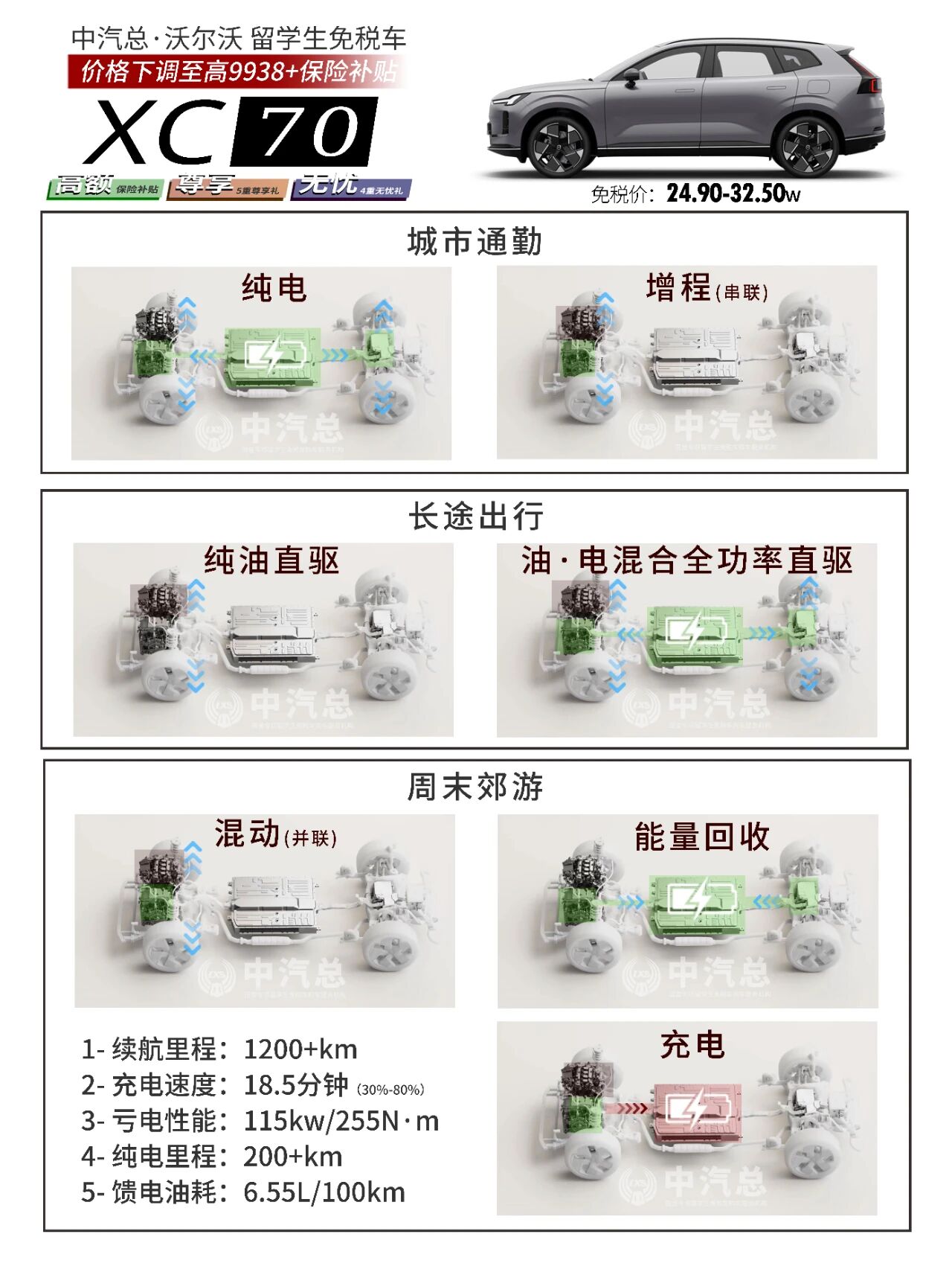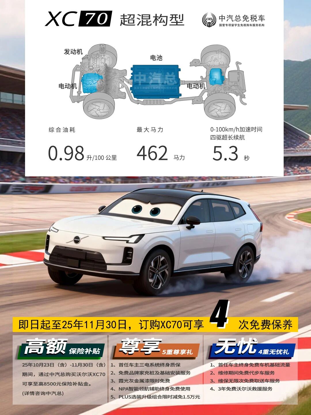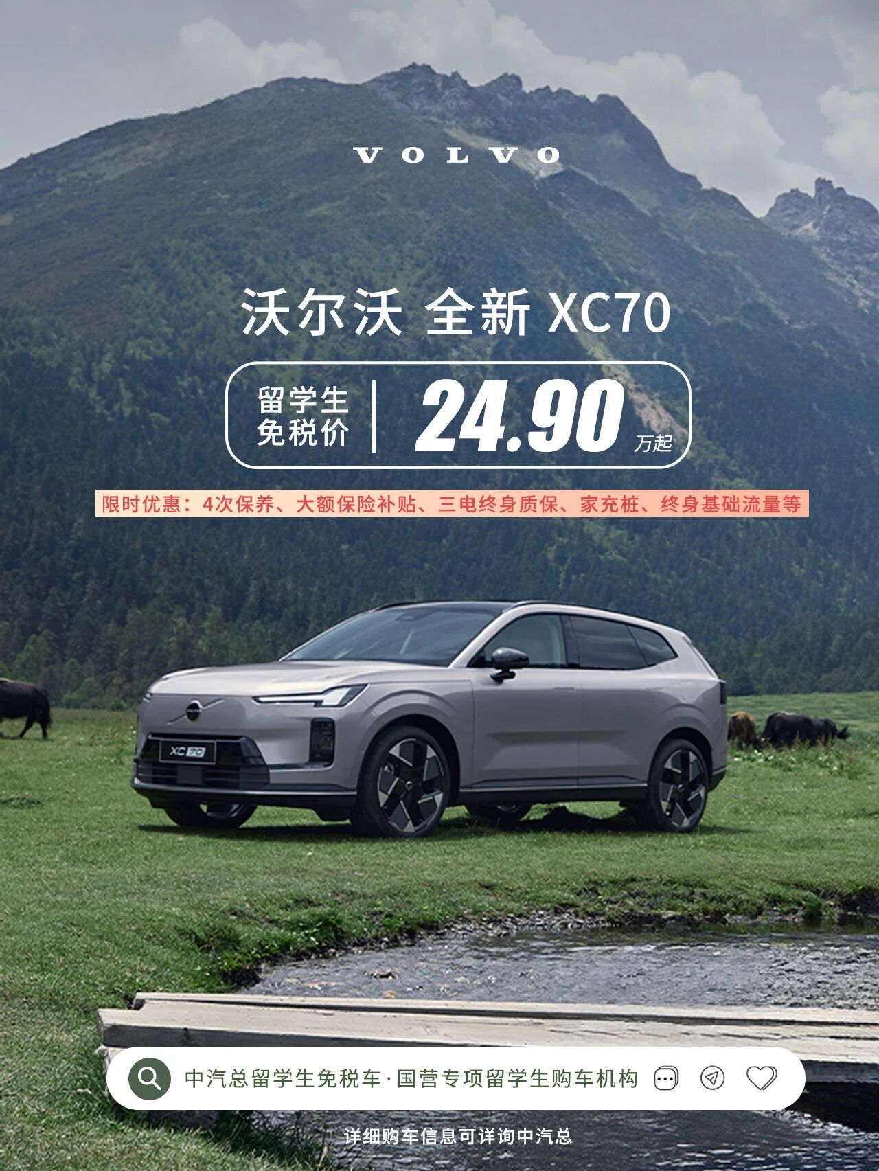 留学人员限时增购/换购活动开启!沃尔沃XC70对广大留学人员开放特惠价格,现可按留学生价格政策享受同等免税购车权益,可油+可电+可增程,综合续航超1200公里。您曾购买或申请过各品牌留学生免税车型,只要您是具备过留学生免税车申请资质(出具准购单等相关材料),现均可按留学生价格政策并享受同等沃尔沃XC70的购车权益。沃尔沃全新XC70留学人员当期优惠价格24.9w起(叠加免费保养+首年车险补贴+首发礼+出行礼+车漆限免等),相对官方零售价格优惠近27w。2025年12月31日前还可以享受购置税全额免征。另有阿尔法罗密欧、捷尼赛思、依维柯等更多车型对留学人员开放购车折扣,期待您的关注。