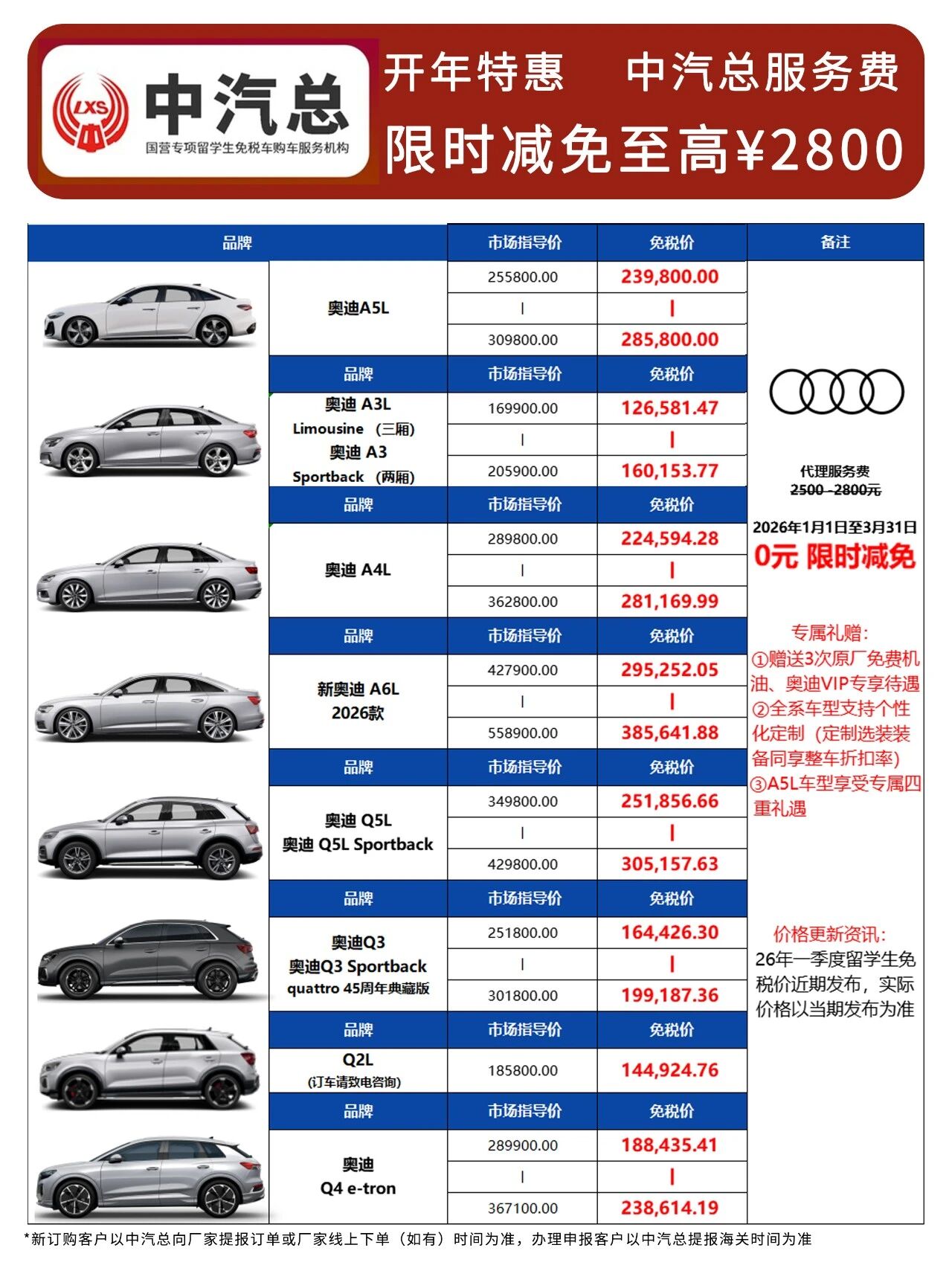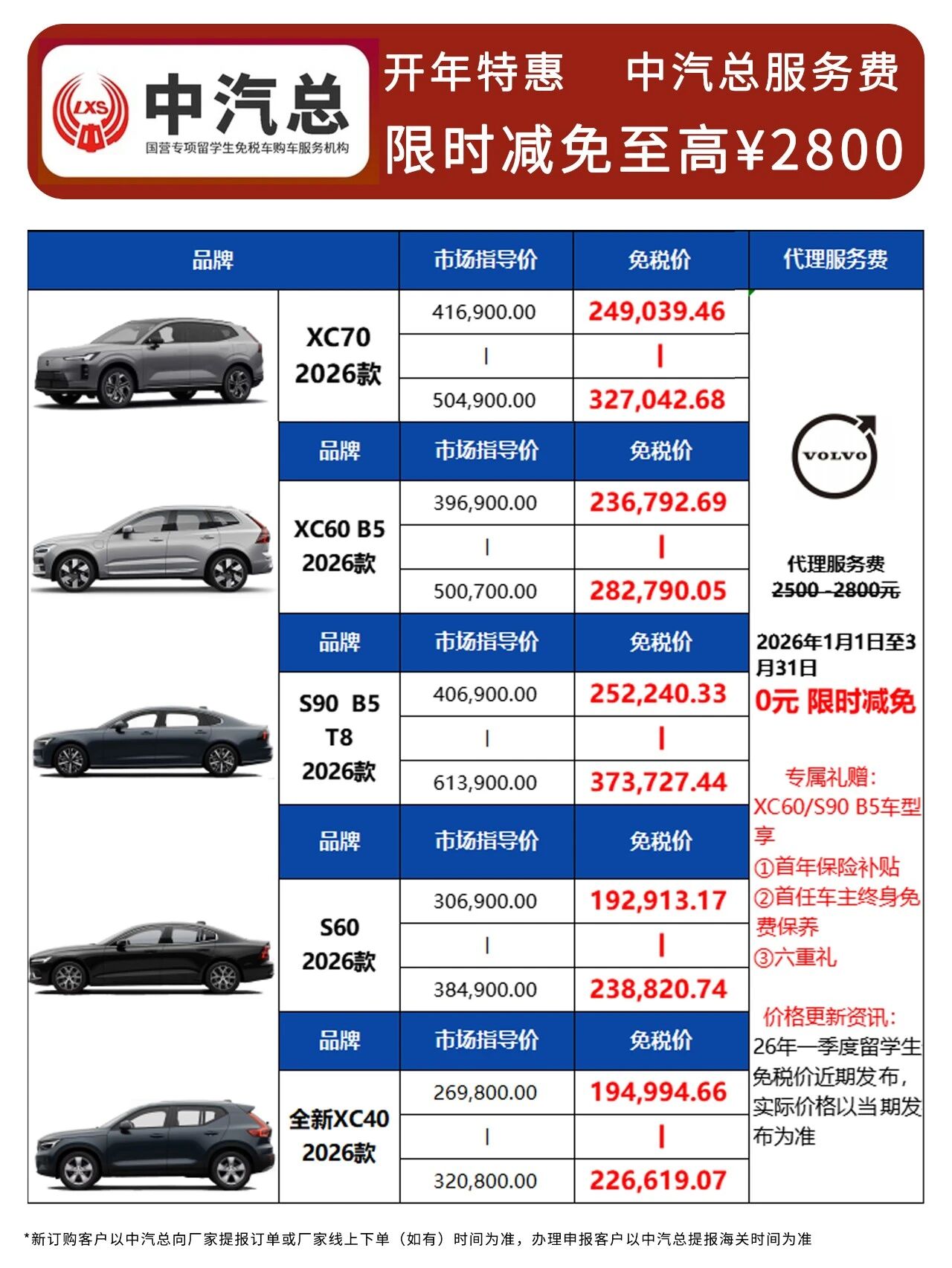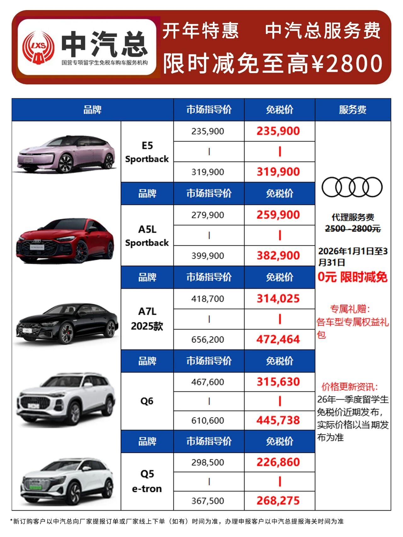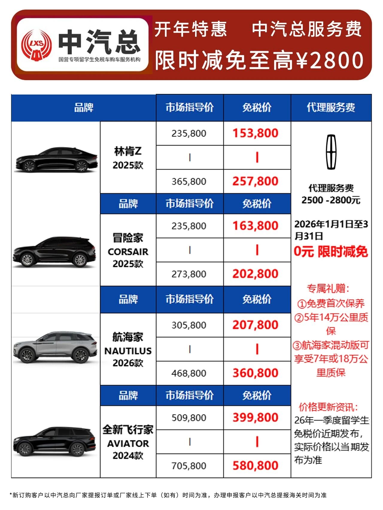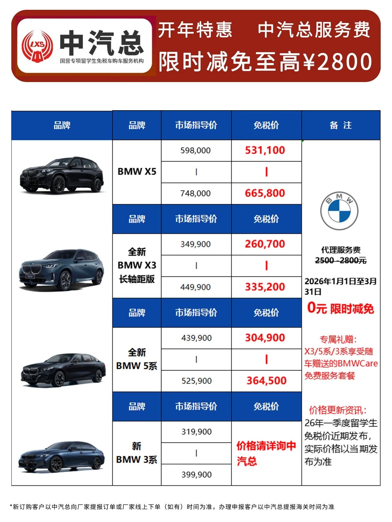 为感谢广大留学生对中汽总的信任与支持,我们特推出 “2026免税车开年特惠活动”——全品牌服务费大减免