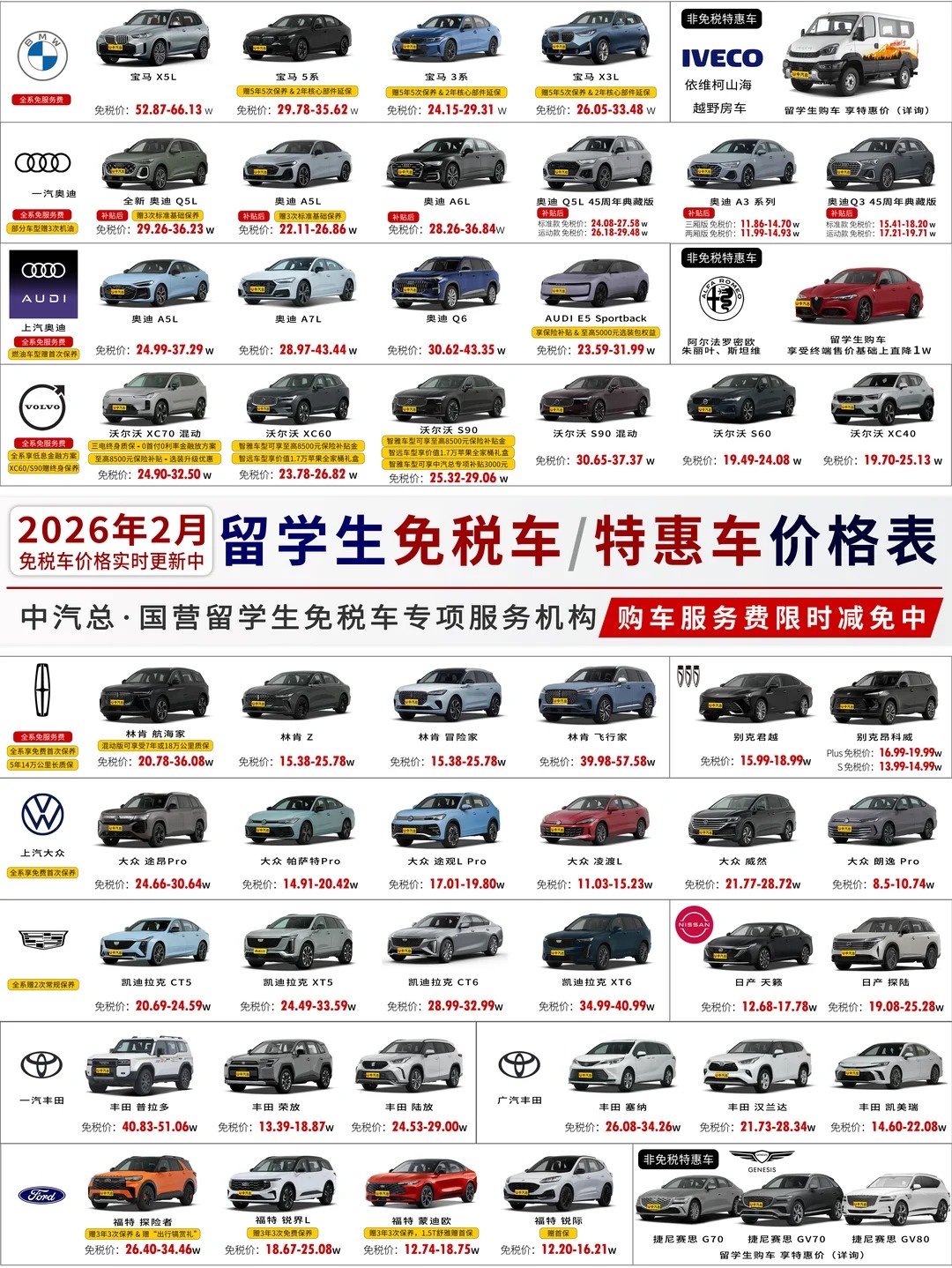 为感谢广大留学生对中汽总的信任与支持,我们特推出 “2026免税车开年特惠活动”——全品牌服务费大减免,至高立省2800! 无论是心心念念的豪华座驾,还是性价比之选的热门品牌,现在下单/申报,就能把这笔“省下的钱”轻松揣进口袋.