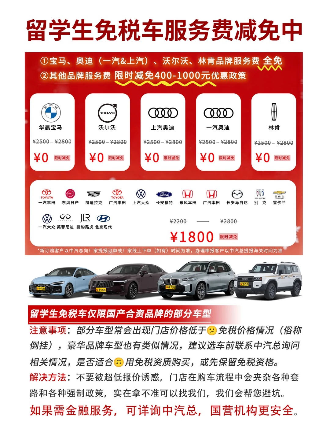 🌟 重点品牌福利(服务费全免) 宝马、奥迪(含一汽/上汽)、沃尔沃、林肯 直接减免全部服务费,相当于“0元享受专业代办服务”